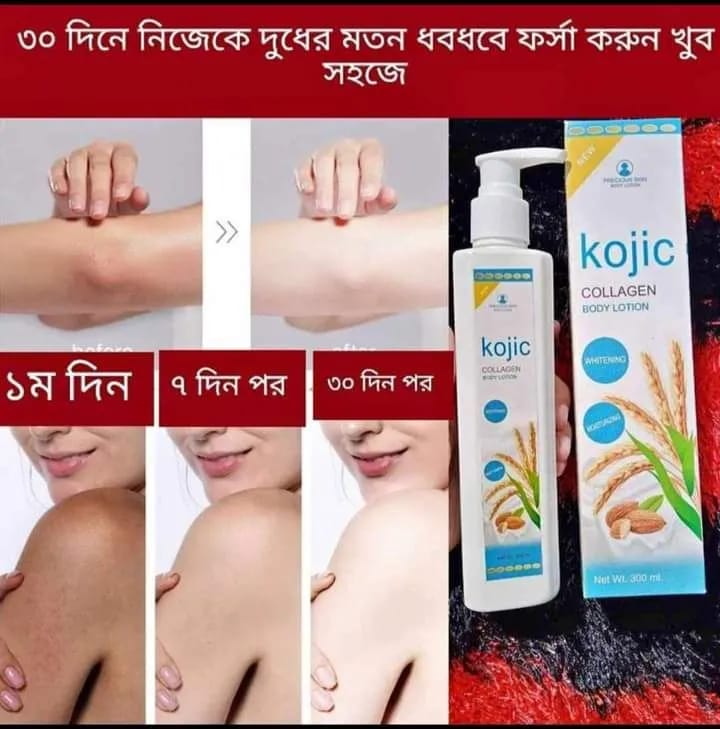 - KOJIC COLLAGEN BODY LOTION - হোয়াইটিনিং লোশন বিশ্ব জয় করা পণ্য এখন আমাদের কাছে। হোয়াইটিনিং লোশন ব্যভহারে আপনি কয়েকদিনেই আকল্পনিয় আকর্ষণীয় অধিকারী হবেন যেটা আগে কখনো কল্পনা করতে পারেন নাই। এটা শুধু আপনার বডির ত্বক ফর্সা করে না, এটি আপনার ত্বকের যে কোন কালো দাগ রিমুভও করে।এই লোশন ব্যবহারে আপনার ত্বকে উপকার ছাড়া ক খনোই ক্ষতিকর কিছুই পাবেন না।